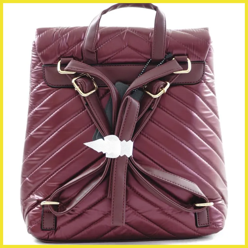 Női hátitáska csillaggal és V varrott mintával, vízhatlan, vörös színben. Fazonja merev, anyaga puha tapintású. Tetején áthajtós, patenttal, alatta pedig cipzárral is záródik. Belül egyterű, egy cipzáras és két benyúlós zseb. Méretei: 32×32×9 cm.